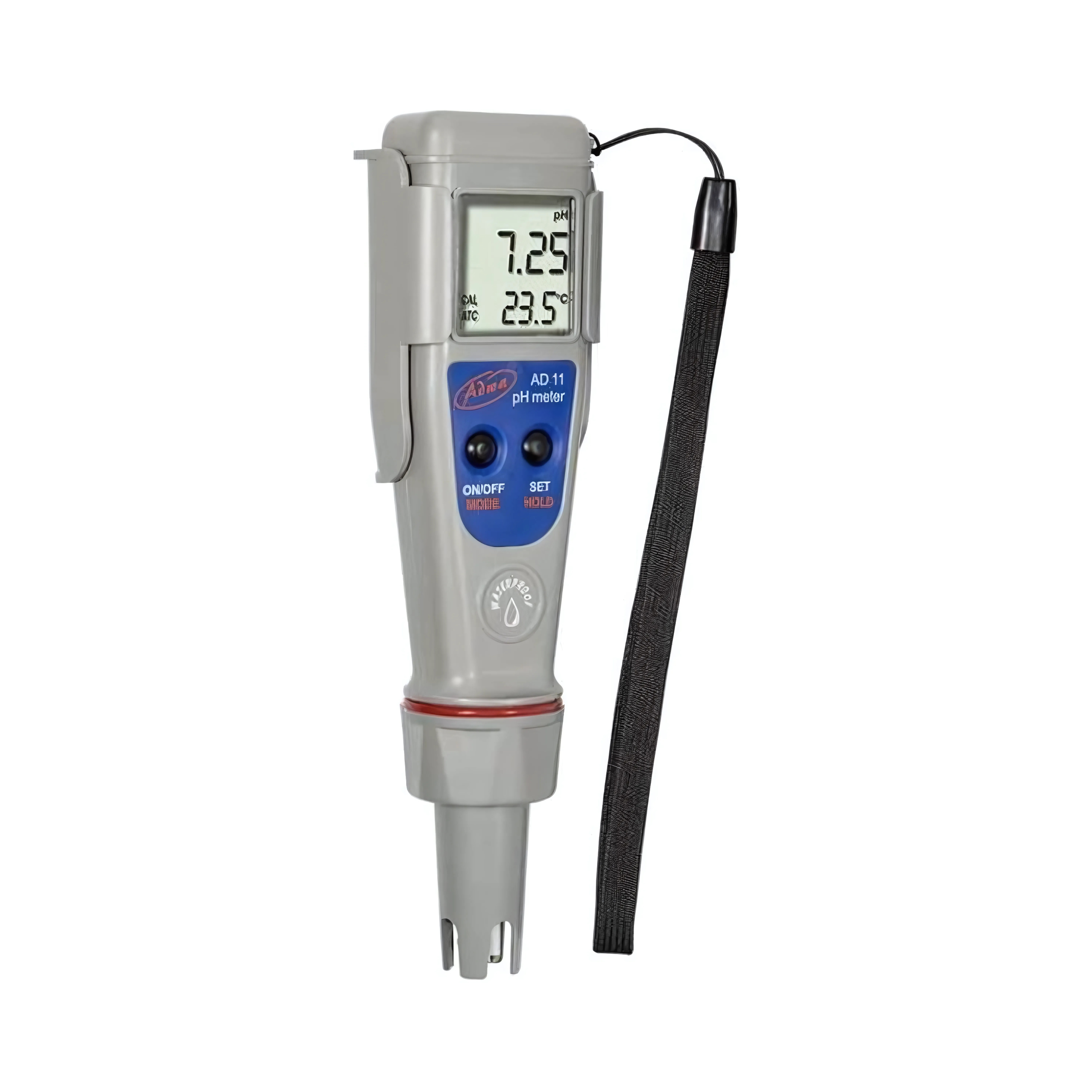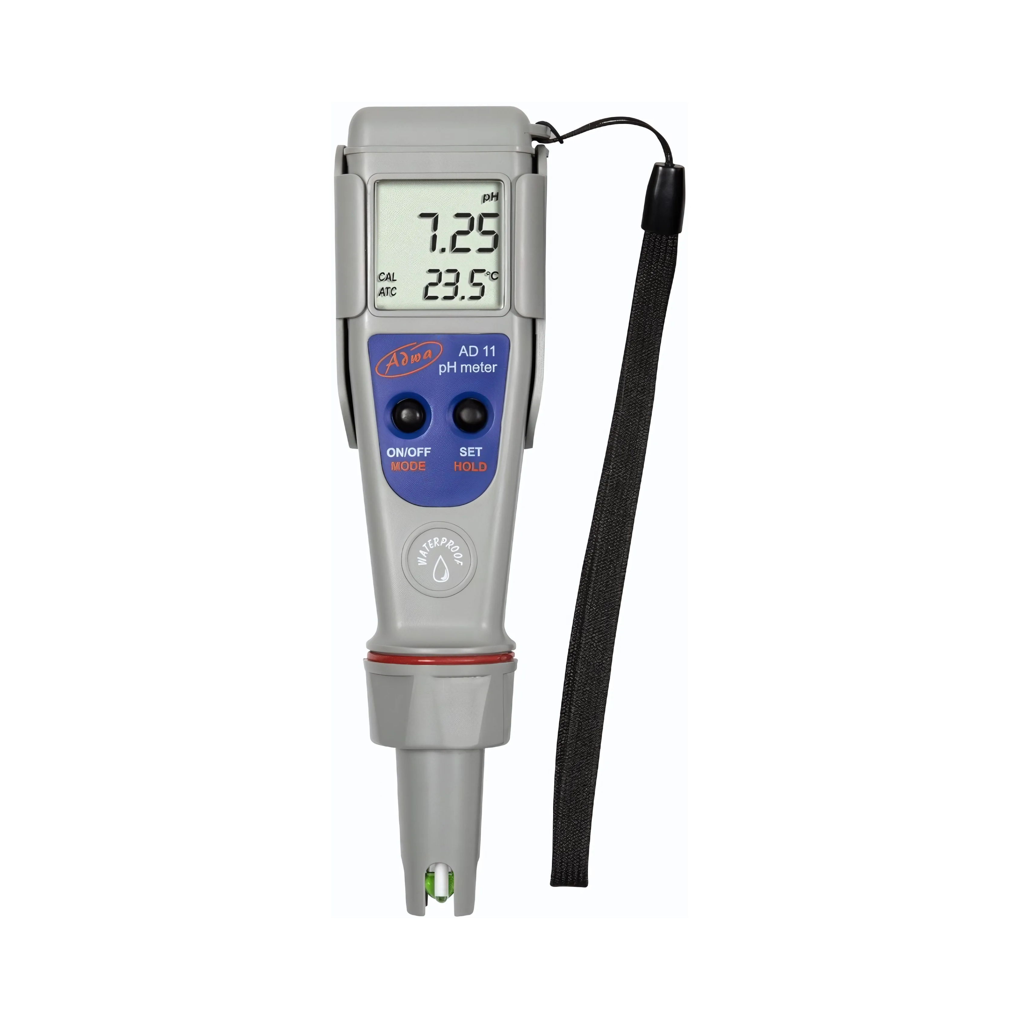 دستگاه pH متر قلمی ADWA AD11 ابزاری دقیق و قابل حمل برای اندازهگیری pH و دمای مایعات در محیطهای آزمایشگاهی، کشاورزی، استخرها، صنایع غذایی و آبوفاضلاب است. این دستگاه دارای کالیبراسیون خودکار یک یا دو نقطهای با بافرهای استاندارد است و با قابلیت HOLD امکان ثابت نگهداشتن مقادیر اندازهگیریشده را فراهم میکند. جبران دمایی خودکار (ATC) دقت اندازهگیریها را افزایش میدهد و الکترود قابل تعویض کاربری راحت و طول عمر بیشتر را تضمین میکند. صفحه نمایش LCD دو ردیفه، اطلاعات pH و دما را همزمان نمایش میدهد و با استاندارد IP67 در برابر آب و گردوغبار مقاوم است. دستگاه سبک، کمحجم و مجهز به خاموشی خودکار برای صرفهجویی در باتری است و با 4 عدد باتری 1.5 ولتی بهراحتی کار میکند، مناسب استفاده در محیطهای مختلف و شرایط کاری سخت است.