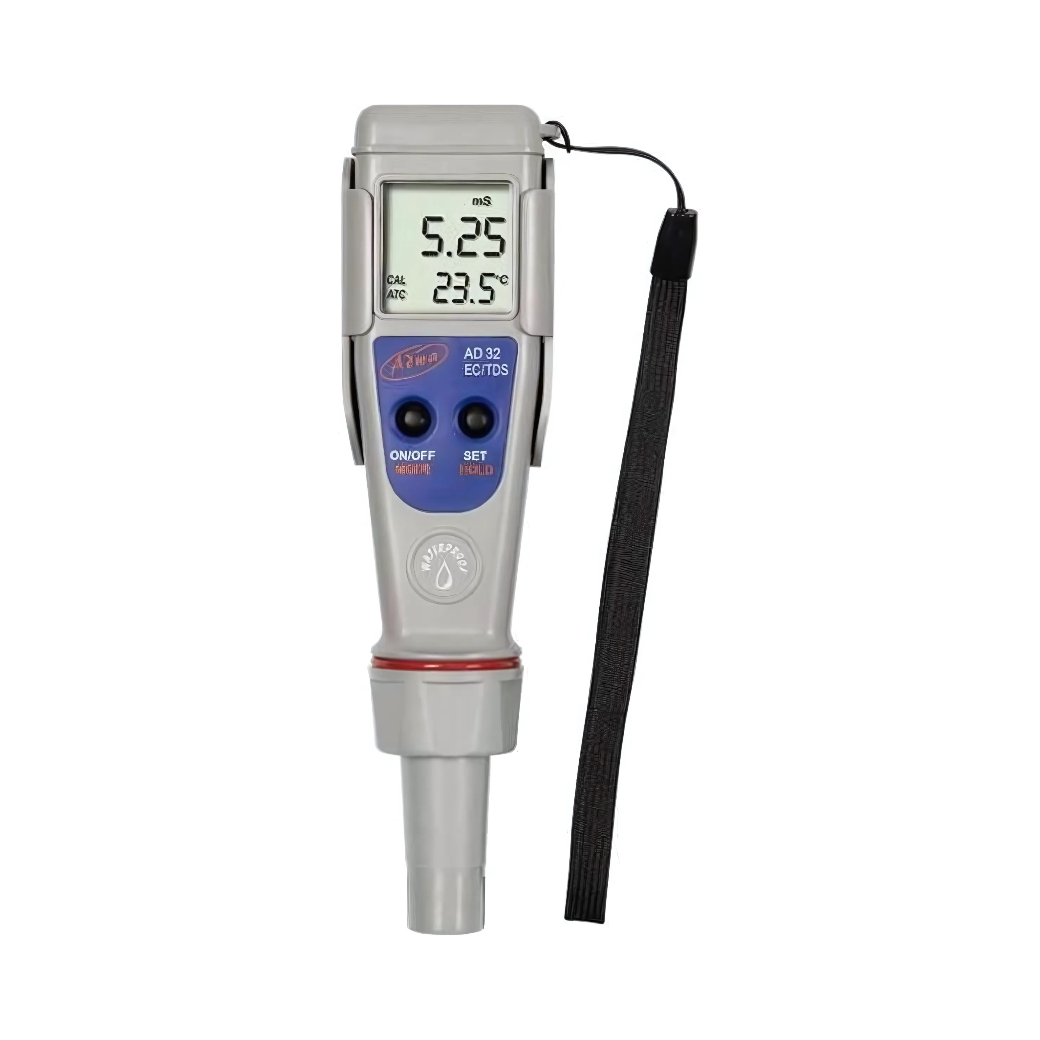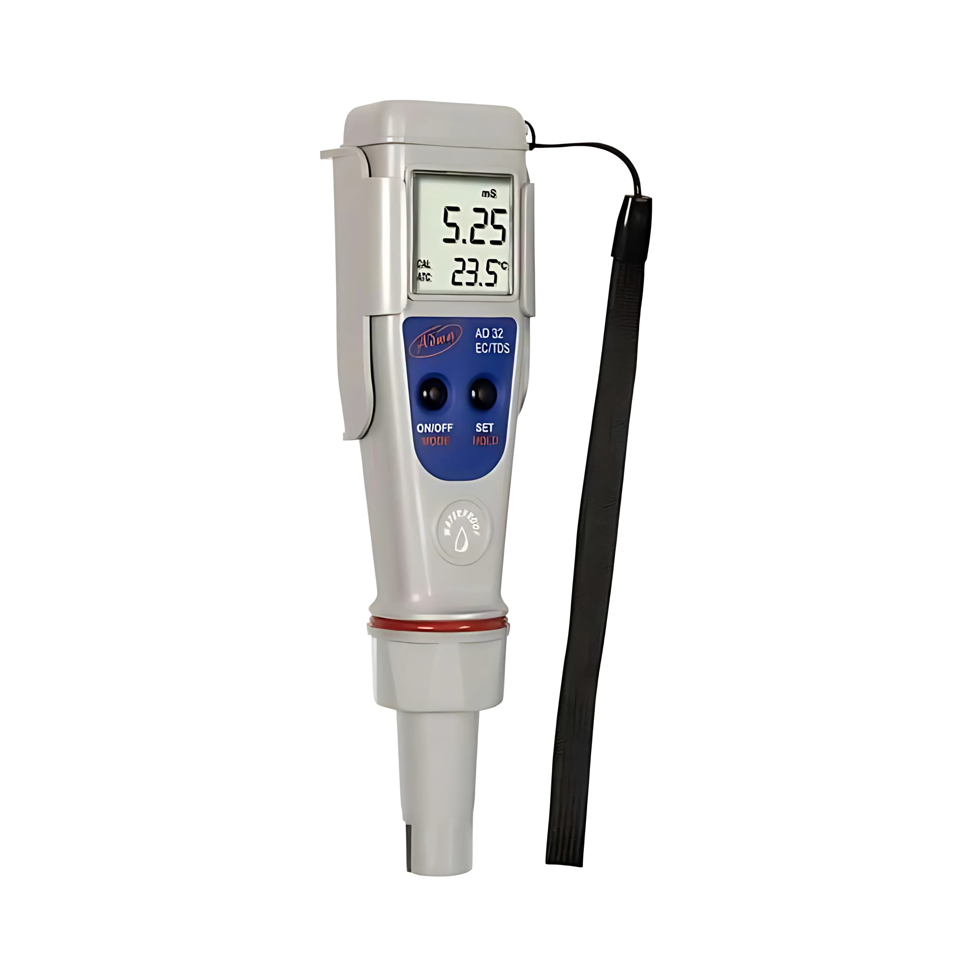 هدایتسنج (شوری سنج) قلمی ADWA AD32 ابزاری بسیار دقیق برای اندازهگیری هدایت الکتریکی (EC)، کل مواد محلول (TDS) و دمای محلولها است. با محدوده گسترده EC تا 20.00 mS/cm و TDS تا 10.00 ppt، این دستگاه برای محلولهای با شوری و رسانایی بالا مناسب است و کاربردی در آزمایشگاهها، صنایع غذایی، کشاورزی هیدروپونیک و پرورش آبزیان دارد. قابلیت جبران دمایی خودکار (ATC) دقت اندازهگیری را افزایش میدهد و کالیبراسیون یک نقطهای کاربری را آسان میکند. الکترود قابل تعویض، استفاده طولانیمدت را تضمین میکند و صفحه نمایش LCD دو ردیفه نتایج EC/TDS و دما را همزمان نشان میدهد. امکانات HOLD و خاموشی خودکار راحتی کار را بیشتر میکند و استاندارد IP67 دستگاه را در برابر آب و گردوغبار مقاوم ساخته است. سبک، قابل حمل و مناسب استفاده در شرایط محیطی مختلف است.
